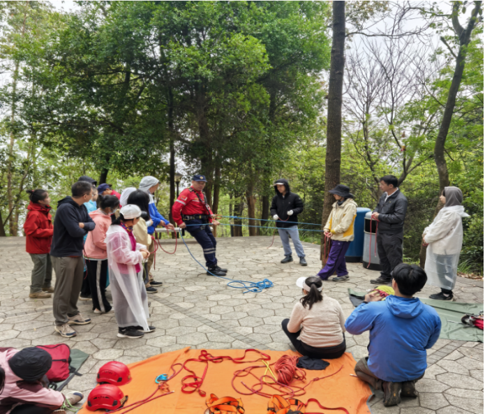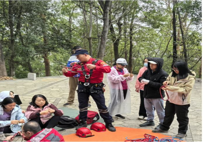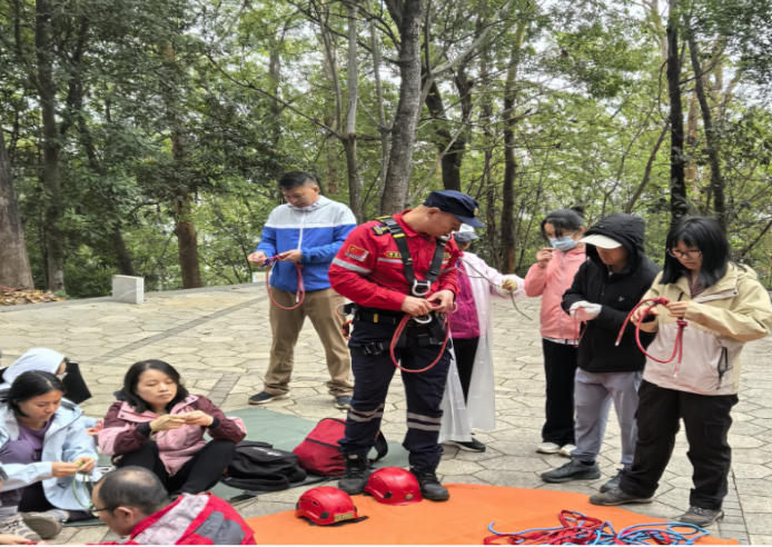 3.教练在详细现场教学志愿者户外技能-初步绳结(单双&反穿8 字结、渔人结< 防脱结>、平结、蝴蝶结), 队员们迅速掌握了四种初步绳结的打结技巧及使用场景