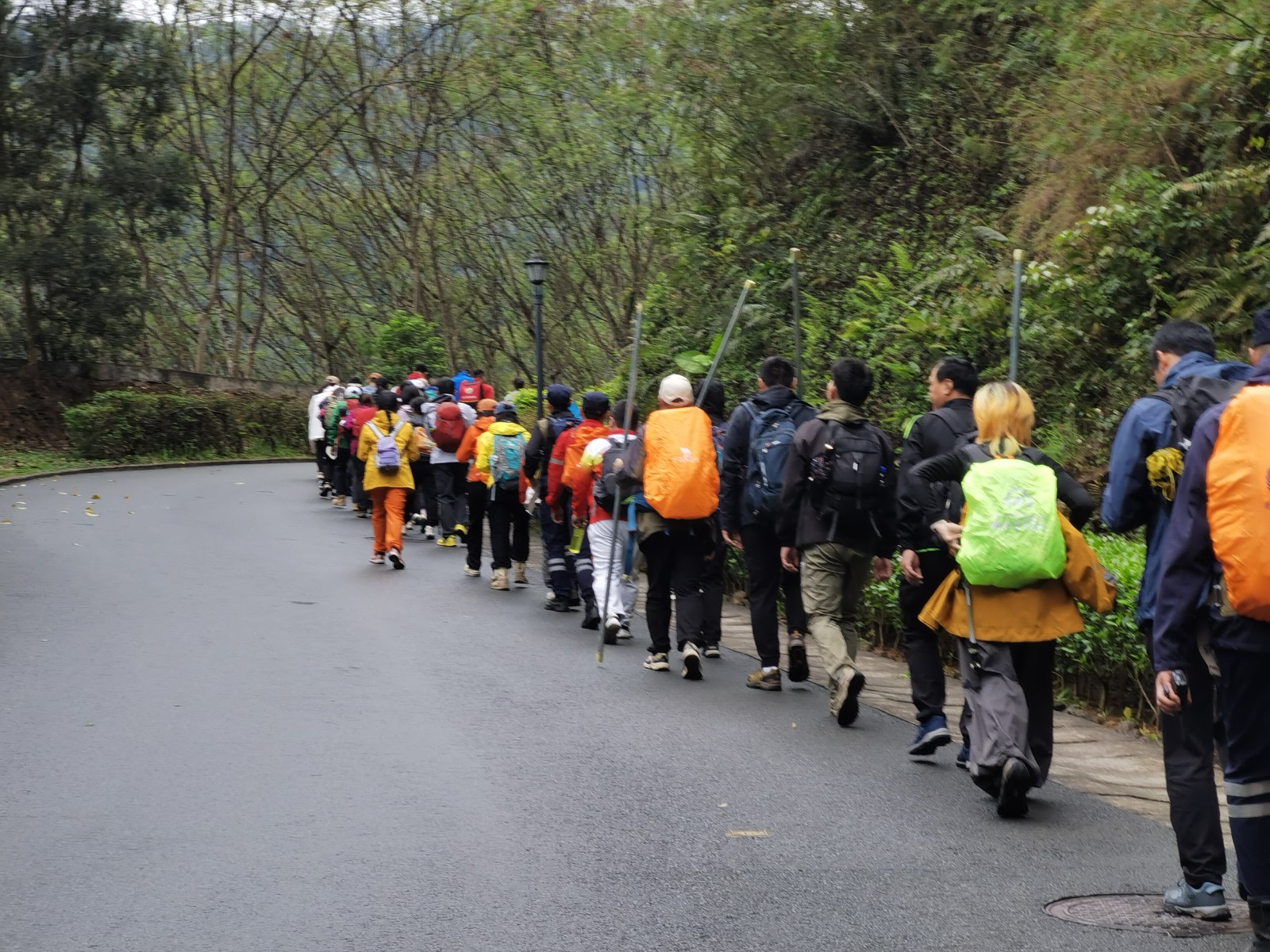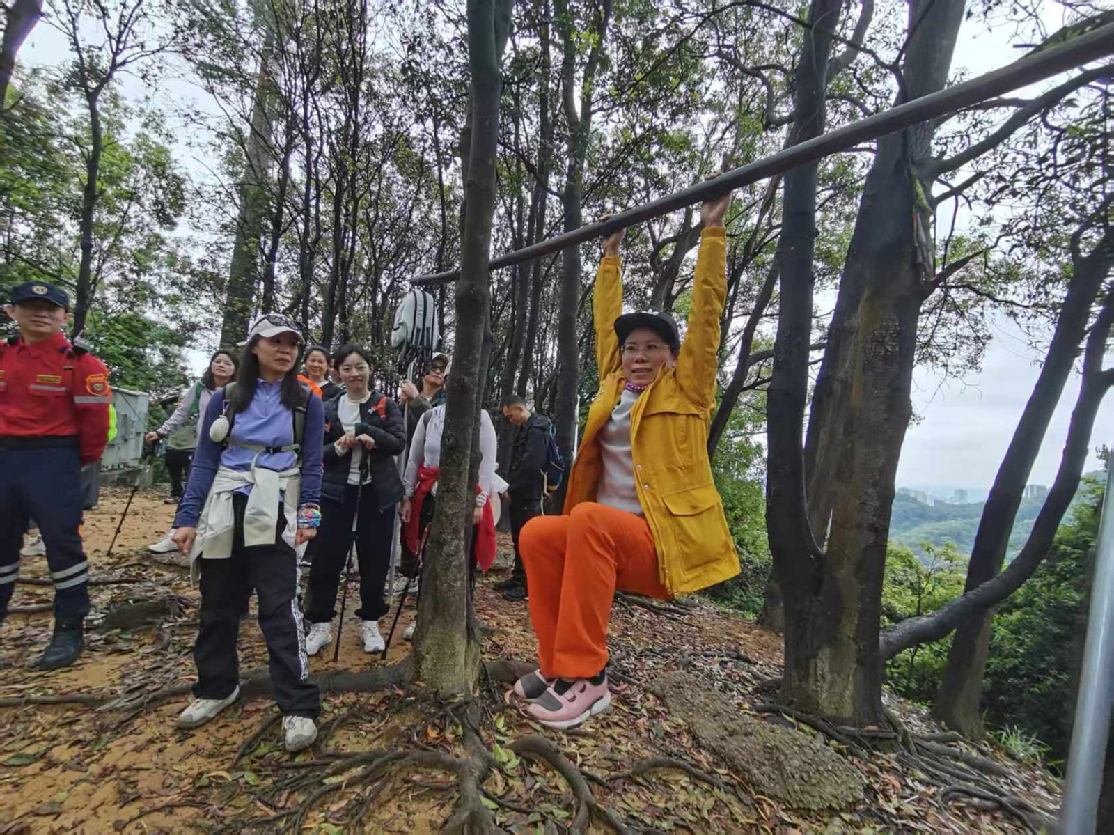文博宫 & 鸡公山户外拉练晨光初染文博宫的飞檐时,我们四十余人如出鞘的剑,在李昌林教官的引领下,踏上了鸡公山的青石阶。山风掠过松林,将我们的队旗吹成猎猎作响的云,仿佛连草木都在见证这场与自然的对话。李教官的教学像一首流动的诗。他握着登山杖,演示腕带发力的刹那,杖尖轻点石阶的节奏,恰似古琴泛音。"登山杖是你的第三条腿。" 他的声音混着松涛,教我们在陡坡中将杖头压成支点,在平路上让杖尖画出弧线。当他展开绳索,单结、渔人结、双套结在掌心翻飞,那些平日里冰冷的绳结突然有了生命 —— 单结如蝌蚪摆尾,双 8 字节似蝴蝶振翅,反穿 8 字结则像游龙戏珠。我们跟着模仿时,绳索在指缝间滑动的触感,竟让我想起幼年学书法时,毛笔在宣纸上晕染的韵律。正午的山风带来野莓的清甜。队员们席地而坐,打开背包里的面包、青瓜与小西红柿,食物的香气与泥土的芬芳交织。有人分享自制的糕点,有人递来矿泉水,笑声惊起树梢的鸟儿。这场景让我想起《