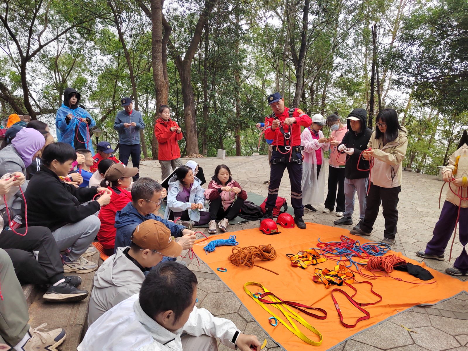 2025年3月29日在文博宫/鸡公山学习——装备基础(绳索技能) 救援之技术装备认识与操作规范,绳结技术,保护站认识; 我是张丽丽,这是我第一次参加较为正规的野外培训,因临时有事没赶上大部队集合及拉练前热身运动,在群里看见大家出发时排着整齐划一的队伍,气宇轩昂的在李队的带领下出发了,我紧赶慢赶根据群里热心小伙伴们提供的定位信息和视频指引,在小路上的平台上跟上了大部队,当时已经学完了如何正确使用登山杖和背包里如何放物资,再出发时第一关就是一个大大的陡坡,垂直向上,我前面走了一个七岁的小朋友,他虽不言语,但一直默默的跟着前面的步伐,对我内心触动很大,翻过小路来到公路上时李教又在途中给我们普及野外一些蕨类知识,包括周边环境位置信息,如何在野外分方向,例如首先找到一个单独的大树,树叶茂密为(阳)南,阴面有苔藓为北,让我更深刻意识到实践出真知。 当大家集合在平坦的半山腰也到了午餐时间,大家把各自带的美