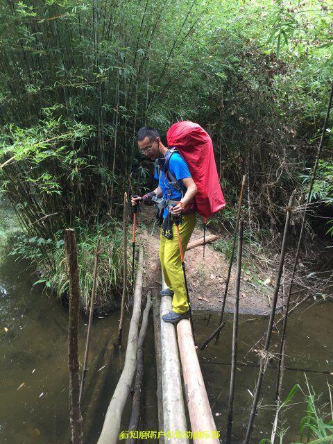 梅雨仰进行了描述与分工就又开始抓紧时间赶路,他的任务就是今天的最后一个目的地,金龟岩营地。走到前面没多远一个桥,在地图上看,我们应该全程走在河道的左边,过了桥就是河道的右边了,此时我就建议他不过桥,直接左转,大家一致认可之后,前行不到三百米,看到了一栋房子,似乎还有人在扎营,做饭,还以为遇到了其他地方的户外团队,到近处一看,原来是二组的童鞋。方丈教练发话,今晚就在这里住下,在这里扎营。本计划赶路到凌晨的我们 ,顿时觉得好惊喜。后来才知道,原来这里才是真正的一户人家。我们的小伙伴交接错了位置,方丈说,从这里 到金龟岩营地的路非常难走,是整个丹霞山最危险的路段,不适合夜行,所以安排大家再这里休息,在第二天的时候验证了整个说法。