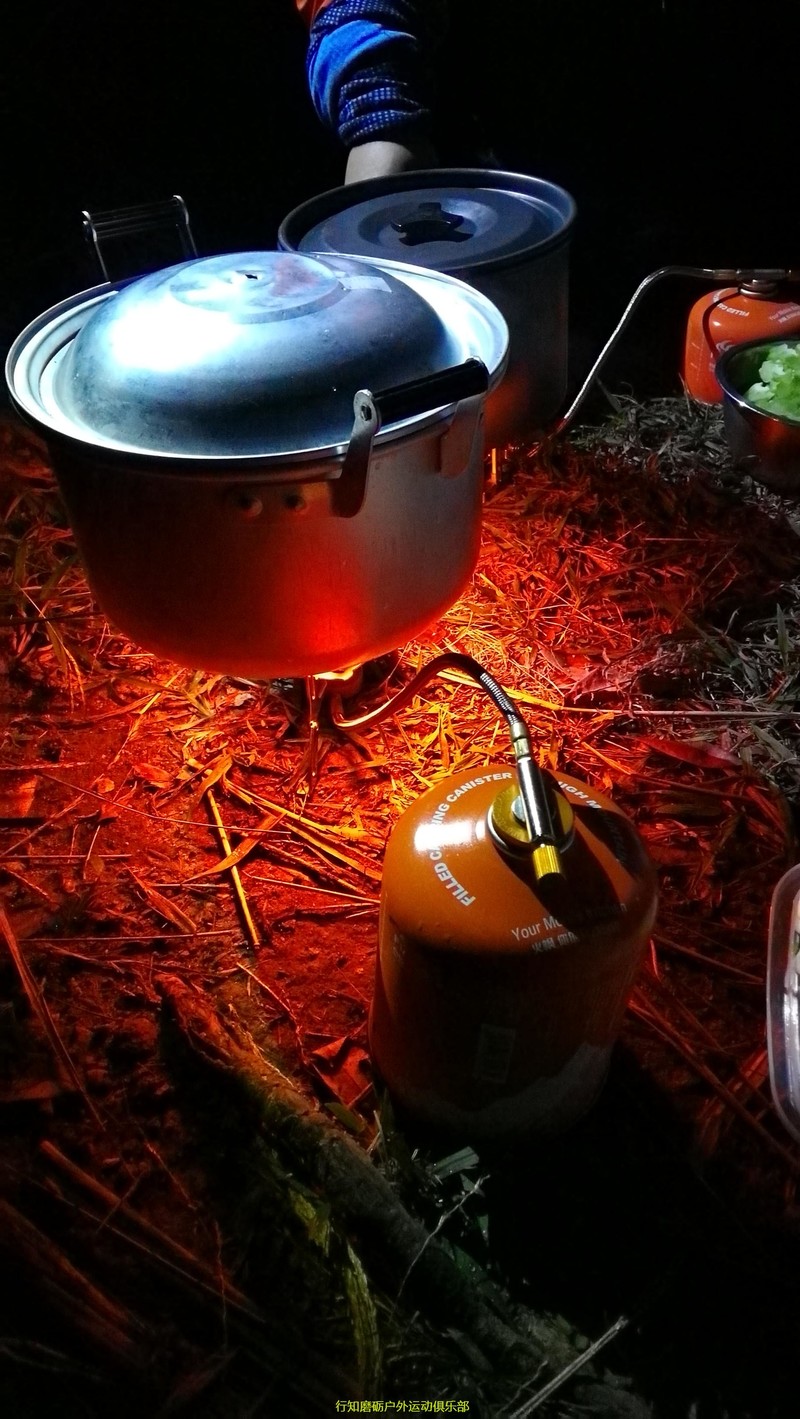 第四段行程,起点领航,接近傍晚,部分下山路有山石和小溪,刚交接走了不远,粒子就踩滑了石头,磕伤了右脚膝盖,发现伤情后,部分队友束手元策,豪哥淡定的检查了伤情后说野外受伤后像这种情况,不适合包扎处理,应该以减低疼痛为最佳处理方法,所以用云南白药保险液喷雾剂对伤口做了处理,果然效果明显,没多久粒子就感觉疼痛减轻了,坚强的粒子后来继续前行,于1800我们到达了峡洞营地;当时对是否到了营地,领队和队员们还举旗不定,犹豫不决,后来还是教练说到了,也难怪大家,事先教练挖的坑说峡洞是一个村庄,有人居住,但当时的营地一片荒凉,杂草丛生,但附近有明显的扎营痕迹和野炊痕迹;二组比我们晚到了半小时,最后一段梅雨仰落水受了轻伤;按分工,当晚是豪哥,粒子,客家哥做晚饭,野外居然能吃到腊肉饭和粒子带的正宗红烧肉!晚餐过后,分小组进行了点评分享,主要找毛病,真有种像部队干部和党员进行的自我反省,大家对当天的领队进行了点评,专挑毛病,这个时候心里有不爽的都可以借机吐槽,那是一个爽;
