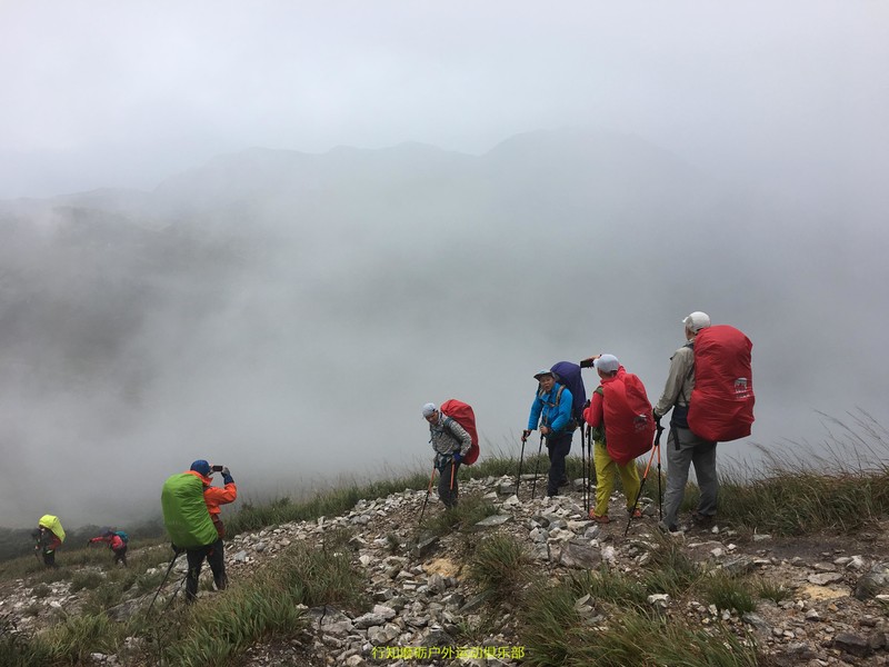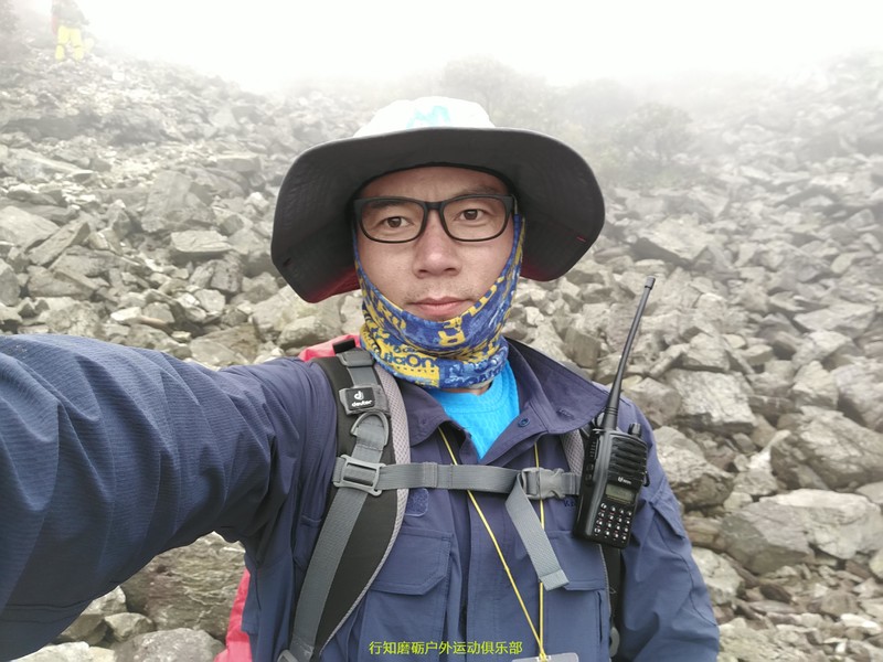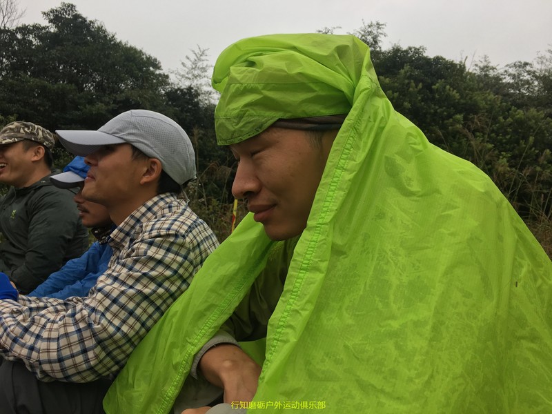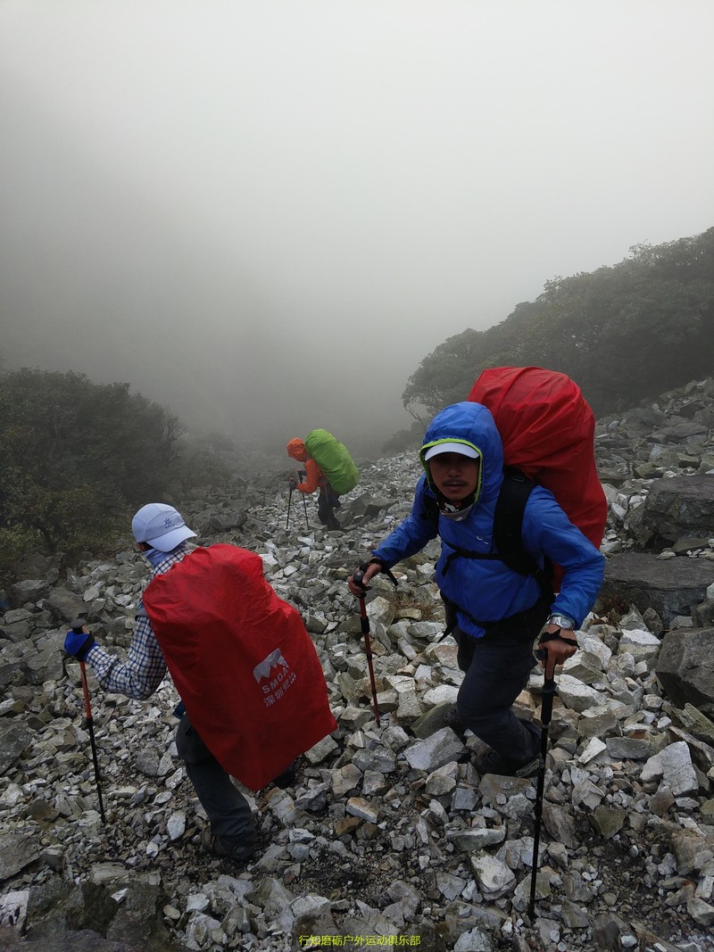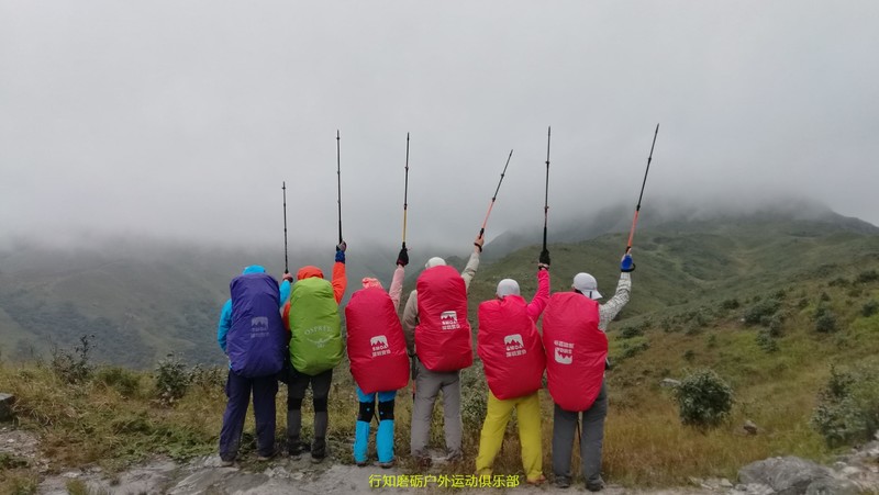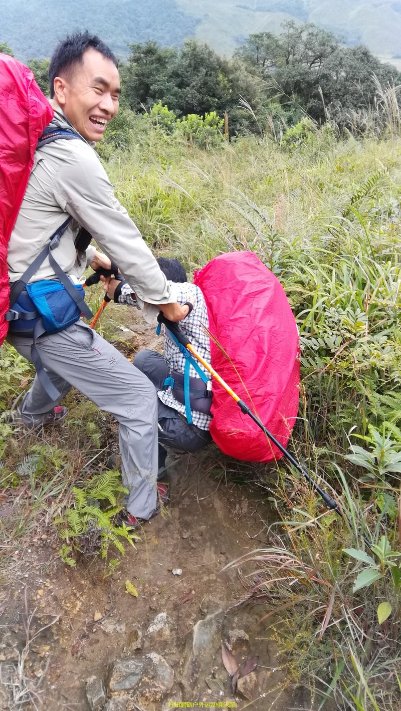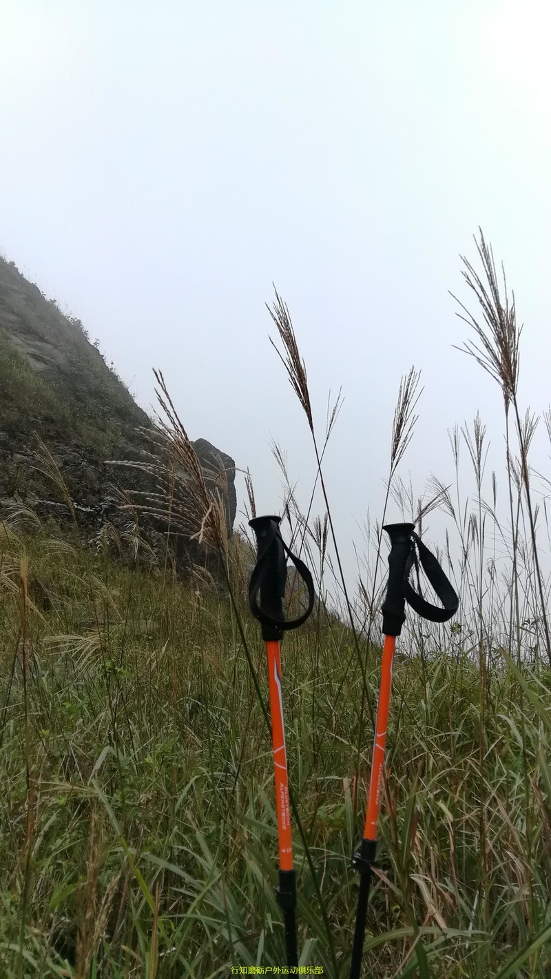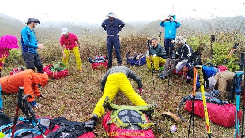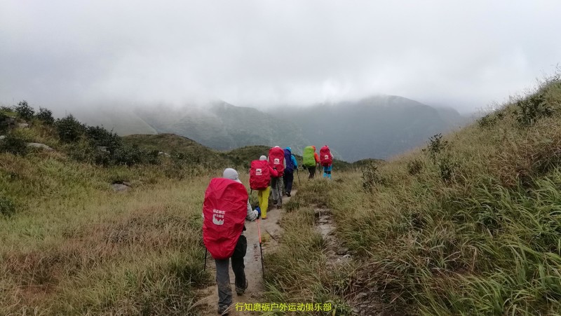 第五段10.21日,早  阴天;一早起来,草上全是雾水,雨水,忍不住拍了几张唯美画面;早餐过后,两组队员一起做了简单的分享,主要是对昨天的行程;每次营地结束,总是有小的问题发现,我们组由于我的失误,也是观念不够吧,早餐洗锅的面条有部分直接倒在了溪水中;起点收帐篷时,地钉遗收了三枚;为此小组做了二十个俯卧撑,起点和豪哥多做了二十;今天,老尹教练跟我们一组,第一段行程,由我领队,由于吸取了昨天的经验,一早就对领队责职做了功课,按计划今天一天的行程不算太远,只是前半段有部分爬升有难度;所以出发时间不是太早;由于是周六,走没多久,在半山腰上我们就碰见了其他队伍的驴友;山越爬越陡,山上的风也越来越大;还有很大的雾气,稍有不慎就有可能滑坠,所以我们行走的速度不算太快,由于雾太重,无法清楚的识别地貌特征,加上对地图的识别不够专业,在未到达检查点时,我以为已经到了,后来在老尹教练的引导下,又继续走,当我们路过白嶂顶后,走了一段下坡路,我才确定了已过检查点;行走在山脊上,呼啸的冷风吹得直流鼻涕,大家加了衣服,但大海的衣服没有防风作用,虽是两件穿身上,一大个子依然冷得直发抖;