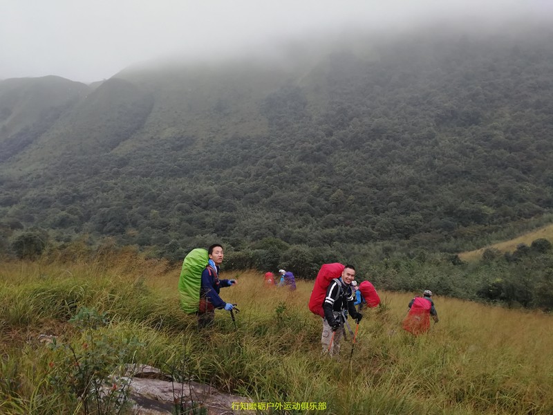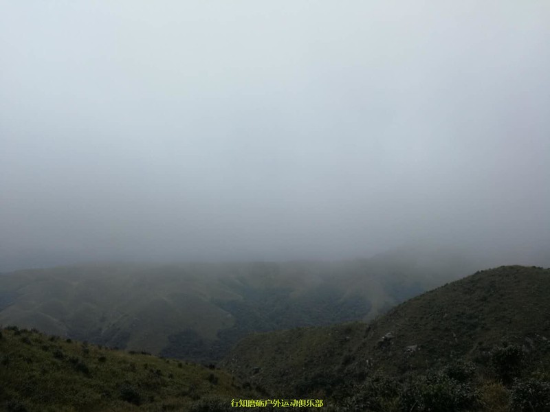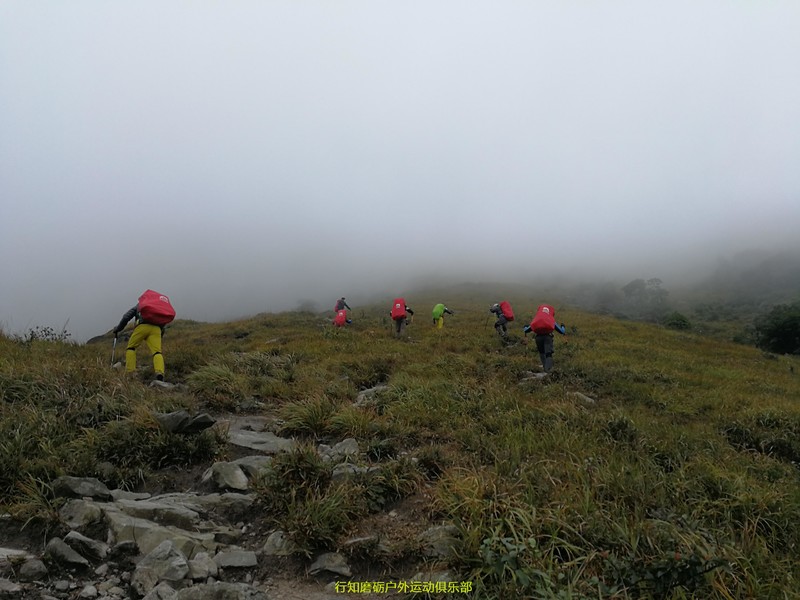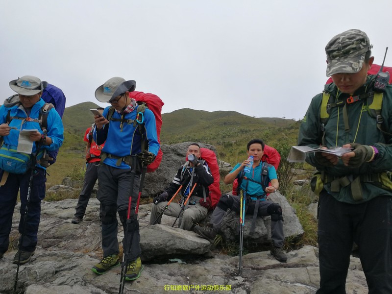 分享总结会开完后,就是由我带队走到CP5高嶂顶,一开始我没有集合热身,就让大家自由热身,开始走的也不是很快,但问题就来了,因为没热身好,脚后跟就开始疼,下次要记得教训,直接果断集合热身,登上一个平台,我凭映像认为是到了高嶂顶了,再根据地形地貌和结合地图分析,通过教练的讲解,才发现还离的远着呢,这里我地图指北针运用不熟练,虽然有大雾,但地貌还是看的清的。