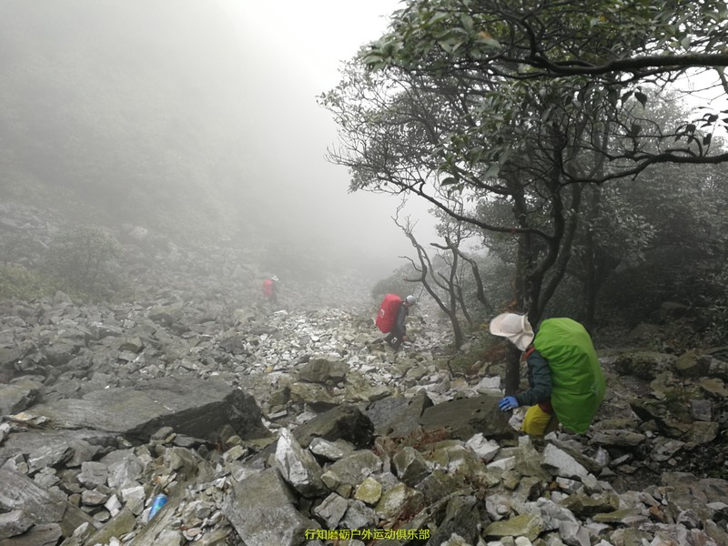 16:55到达第一个乱石坡,往下走还是不好走的,又要小心脚滑,还得小心落石砸到前面的队友,在这里,队伍还没有脱节,大家相互关心,小心翼翼的下到去第二个乱石坡分叉路口。