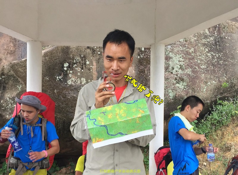 直到我们来到半山腰凉亭,发现前方已无路可走的时候,领队才发现我们可能“迷路”了!于是我们在凉亭卸包“找路”,通过单切法和后方交汇法,再结合地形地貌我们最终确认我们走错路了!我们快上到“五仙岩”顶了!