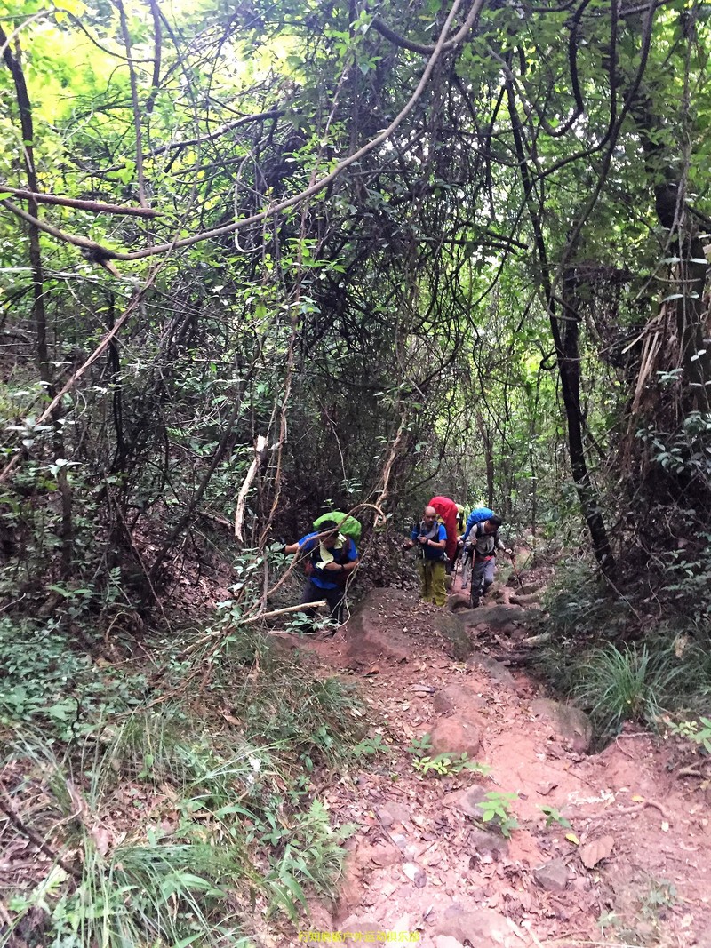 短暂的补充食物和饮水后,我们继续沿着谷底前进,没多久就发现一处向右边山上垭口爬升的路。我们毫不犹豫的选择了这条路。方丈大师开口了,说恭喜你们走出了“恐怖谷”,原来我们刚刚走过的就是恐怖谷啊!此时路边的树枝上渐渐出现了红丝带,证明我们选择的路并没有错。在这里我们赶上了提前出发的二组同学。由于时间关系我们并没有按照计划上“金龟岩”,趁二组的同学在垭口吃午餐的时机,我们从超过他们从垭口直接下去了,下去的路是景区台阶路比较好走。此时天空开始飘起小雨了!