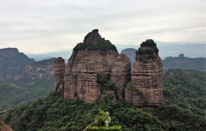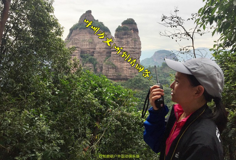 我们来到一处半山平台,此处正对观音石和巴寨顶,是复习后方交汇法的好地方,在此方丈大师让我们复习了单切法和后方交汇法,并对不懂的同学予以逐一指点。为了抢方丈教学的镜头,我光荣的摔了一跤,不幸的是双膝髌骨刚好碰到坚硬的岩石。这一跤生生的折磨了我将近一个礼拜!