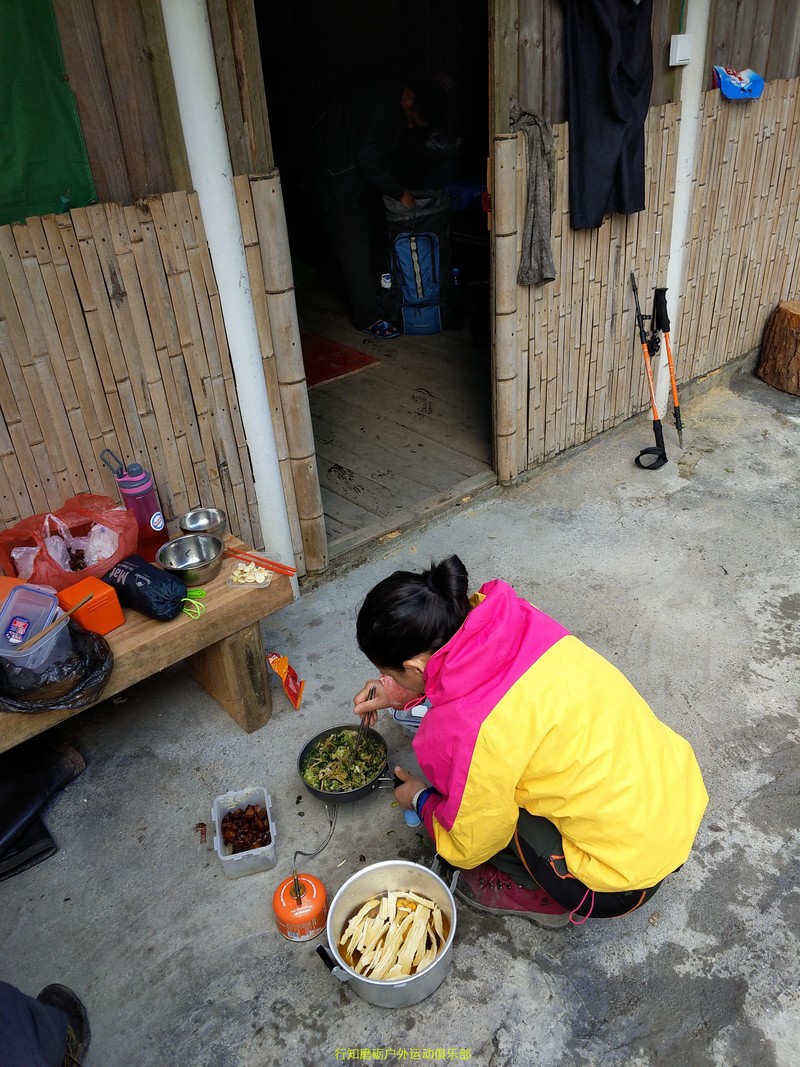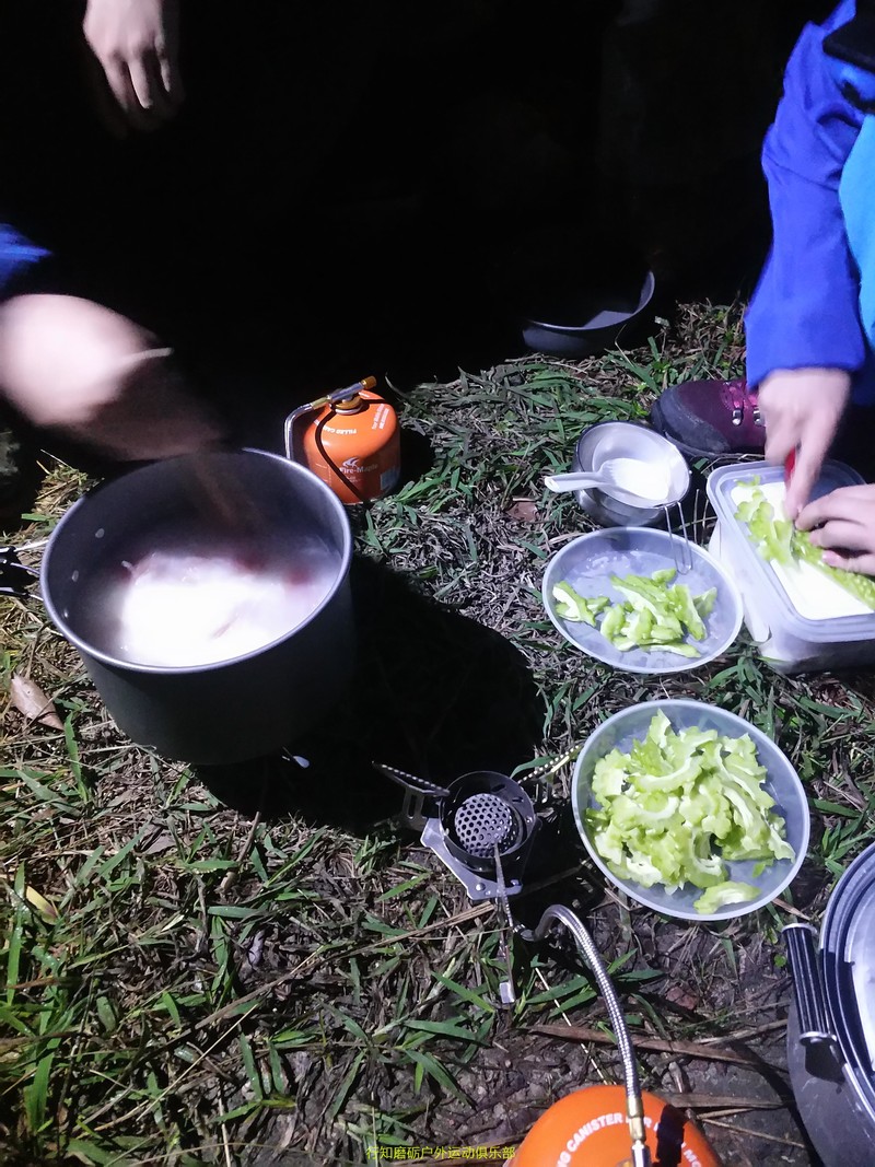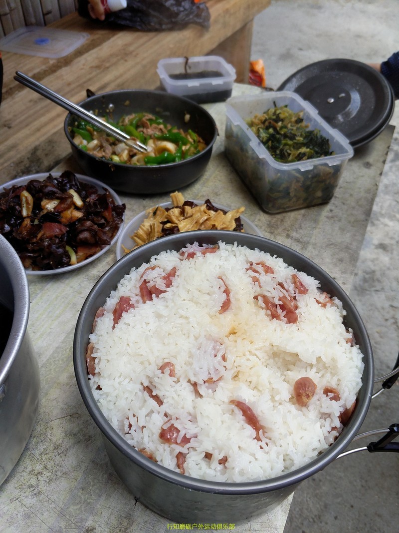 一大早起床为我们做早餐的粒子同学,辛苦了在户外能吃上这么一盆红烧肉,该知足了吧。 感谢粒子的四菜一汤,感谢豪哥的腊肠饭,真香喷喷