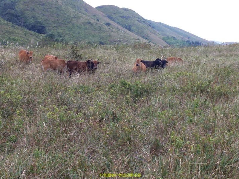 我们走到一群牛的位置时,原本是一个Y字形岔路口,一左一右,左边是正确的道路,恰巧被一群牛给挡住了,我们豪哥看到一群牛不知道是不是平时吹牛 吹多了,看到牛就怕,就赶紧往右避开了这群牛,同时 也避开了正确的道路,随后爬升到一个山顶的时候发现方位角有错了,再往前走很难到目的地,估计还要绕很远的山路,没办法原路下撤吧,下图就是教练带领我们领队豪哥下撤的情景。领队已经被教练“撤职”了,豪哥你咋整的!宝座都丢了
