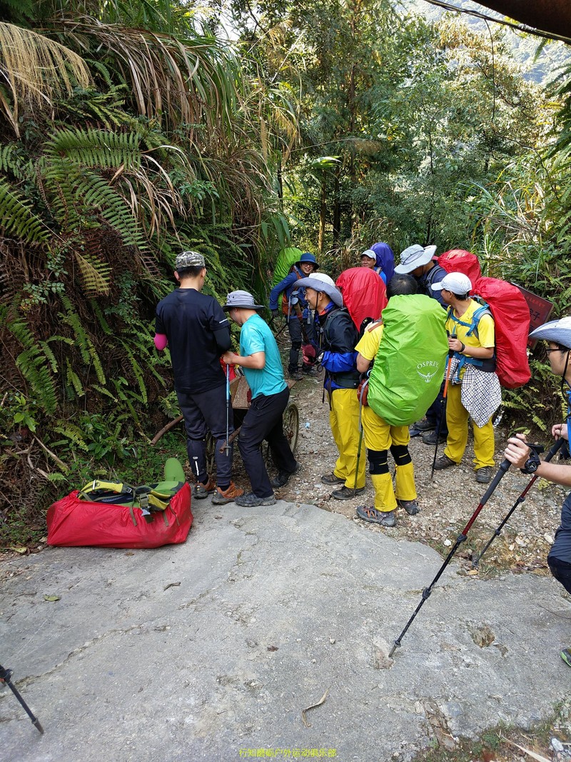 从这个桥过去以后我们向左转方向走错了,实际上如果走右边应该也是可以上山的,结果我们豪哥直接带我们 返回村子旁边选择了另一条路,走到前面还是一条桥,同样两条路,大家这个时候想改变个走法,前两次向左转都错了,豪哥我们来个向右转吧,哈哈,这个时候我们豪哥估计也是蒙圈了,就听了大家 的主意,向右转,结果没走几百米是一个半截路,原路返回,这个时候就有答案了,那坑定向左走啊,接下来就顺畅了,向左之后过了一条和紧接着就是爬升了,这个时候我看了一下轨迹,我们在山下来来回回跑了已经有六公里了,耗时2:30小时,如果知道路的话,从营地到这个登山扣估计不用20分钟。