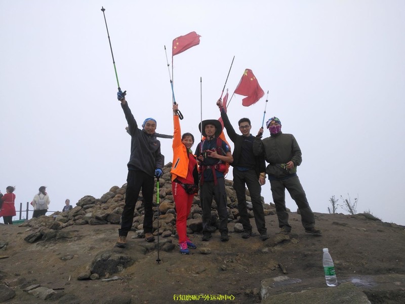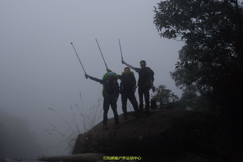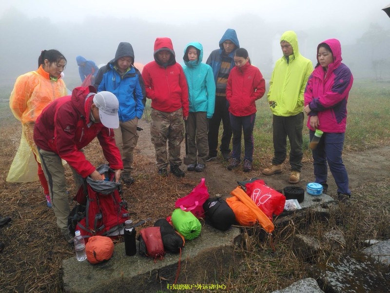 晚上露营下起了小雨,最低气温7度,我的2-8度睡袋开始很暖和后面也感觉吃力。伴随着小雨阵风大雾进入了半睡半醒的状态。 DAY2.(11.19日) 大约7点,一大早起来,就听说有几个队友帐篷没把外帐拉开,进水,凌晨1点半开始,在厕所里跑步取暖,还好只是个案,这个队友身体硬朗。 7点开始早餐,然后妥善处理垃圾,大部分打包带走。然后又开始第二天的培训,装包,打绳结,拉升等团队合影。 大约10点半就开始了第二天的行程,走约1.5小时就来到了最高峰飞云顶,当然是要合影留恋啦。 然后一路下山到海拔约400米位置授课急救知识和理论考试。 大约5点半到山下FB聚餐。