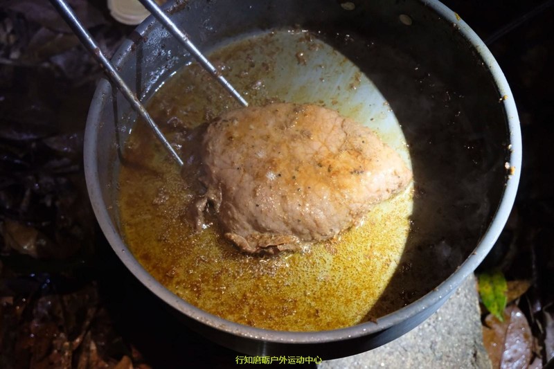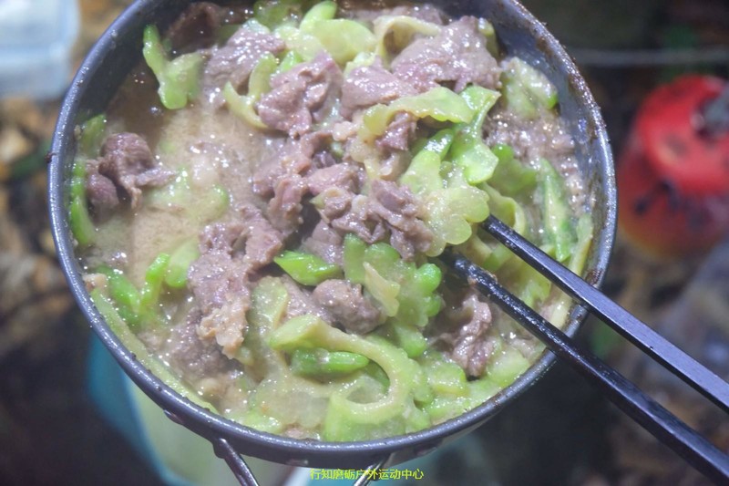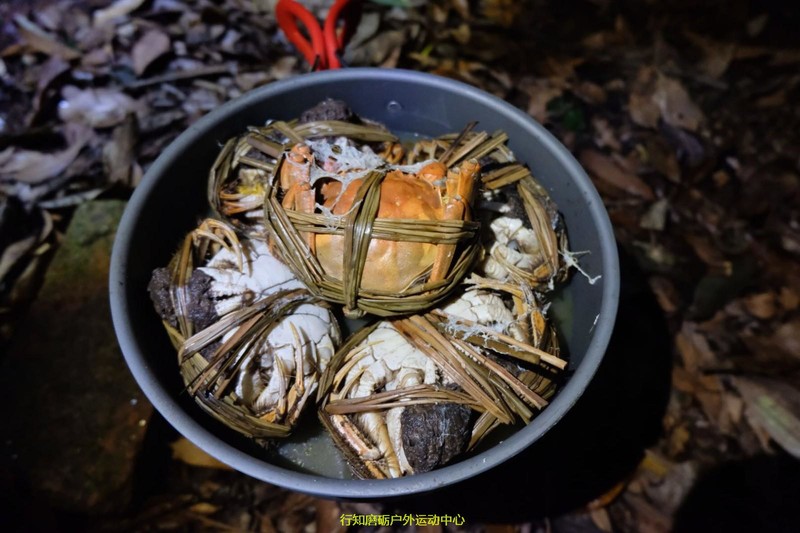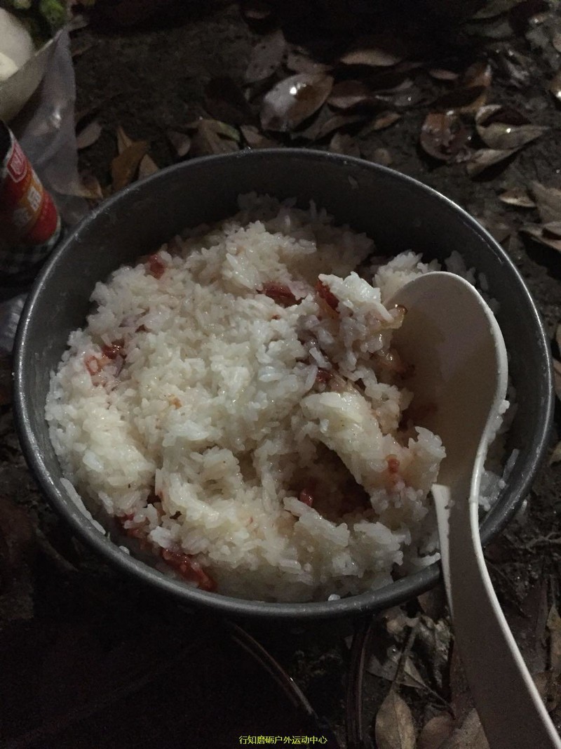 下车后八公用物资分配好以后接着三米教练带领我们做静态拉伸并合影留念,然后开始出发,讲真我真没有背过这么重的背包,在家里称了一下12KG,接着又给我分配了2斤米2斤面4斤肉丸,这下背包都有16KG,32斤啦(我是自愿背负米面肉因为背包太小就背了体积小重量重的); 接着就开始分两个小队重装攀登,一路陡峭的土路也是把小伙伴拉开了距离,到海拔1000米左右就到了瀑布边上来一个装13的照片,这里开始就不陡峭了;接着一路前进到达露营点,累计海拔攀登720米(海拔1100米左右到拨云寺),听我讲是不是很简单,没错其实还没有梧桐山难,除了背负重一点,但是因人而异吧,也有小伙伴累的不要不要的,哈哈。 下午4点半到达露营点开始搭帐篷,还好我之前有准备(上周参加了深圳帐篷节去学经验),搭万帐篷我们队友就去开始准备洗菜做饭了。我也一次在户外煮米饭,腊肠煲仔饭,煎牛排极品【鸡排,凉瓜牛肉等,1队的大神还带了大闸蟹,原来露营也可以吃的这么FB,哈哈。 吃完在教练领导下叫我们户外开炉基本知识培训LNT原则,环保一直使我们的重点,所有餐厨垃圾都妥善处理打包带走。