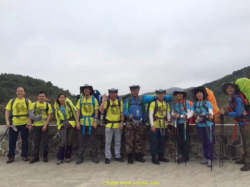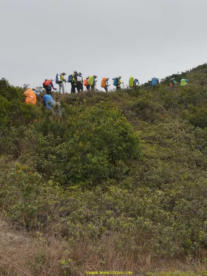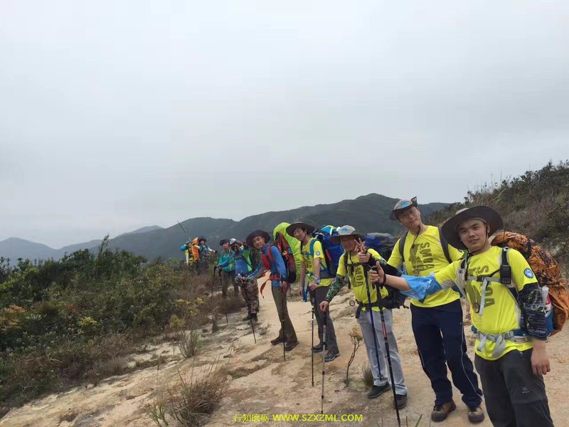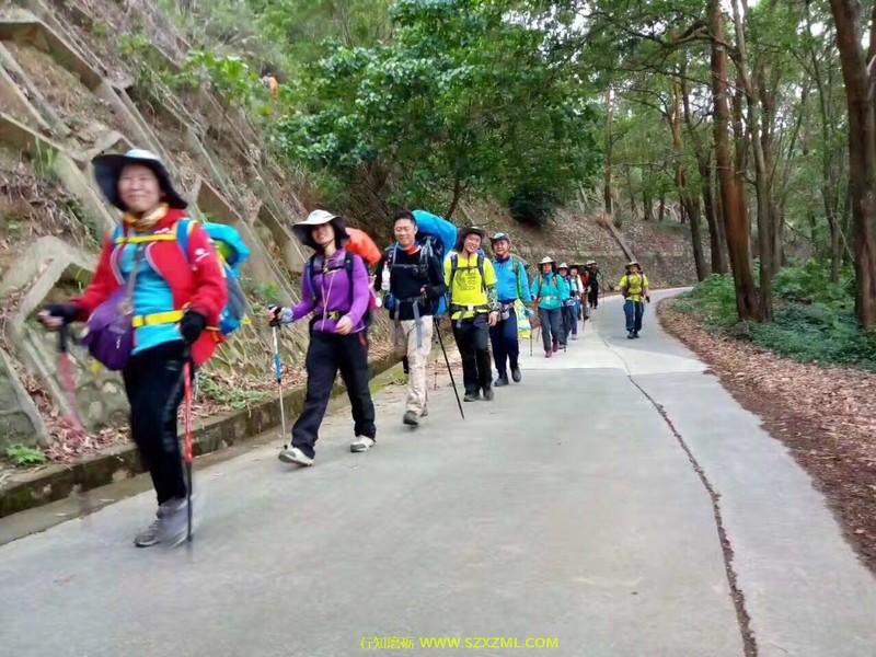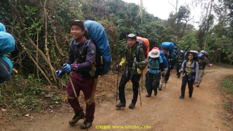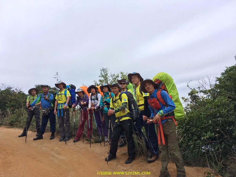 充满挑战性的野外课于3月25日在大鹏半岛的半天云拉开序幕(始点半天云,经抛狗岭—289—鹅公(营地)—大鹿湾—尖峰顶,终点西冲口),怀着激动的心情与伙伴们朝着共同的目标行走。   能干的江山教练教大家怎样填包、起包上身。开始行走前,幽默的情生教练带领大家一起做热身操,拉伸全身肌肉、关节,便于更科学,更安全地行走。我们一组学员10人,留影后经过一栋房子开始土路上山,路上教练教大家怎样使用登山杖,上下坡怎样背包......路上,分工明确,有负责领队的、有收尾的、有安全员、有环保员,为给每人有锻炼、体验机会,每到一个山头一处休息区,教练会提出轮流领队,每到一个叉路口,领队则