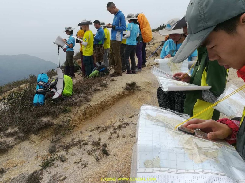 一路行进,都有严密的分工,有负责领队的、有收尾的、有安全员、有环保员,为给每人有锻炼、体验机会,每到一个山头一处休息区,教练会提出轮流领队,每到一个叉路口,领队则要判断路线,掌控间隔距离报人数,理论知识与户外实践相结合,讲得最多的还是地图与指北针,反复的测方位量距离,不断纠正确认。
