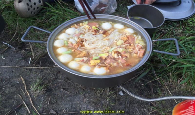 4月29日,美丽的早晨!老班长小辉和其他队友早已经起床准备美味早餐,鸡蛋肉丸面条,老班长责任心强,有担当,有凝聚力,还是大厨,跟着老班长就是幸福!想起这首歌曲“我的老班长”