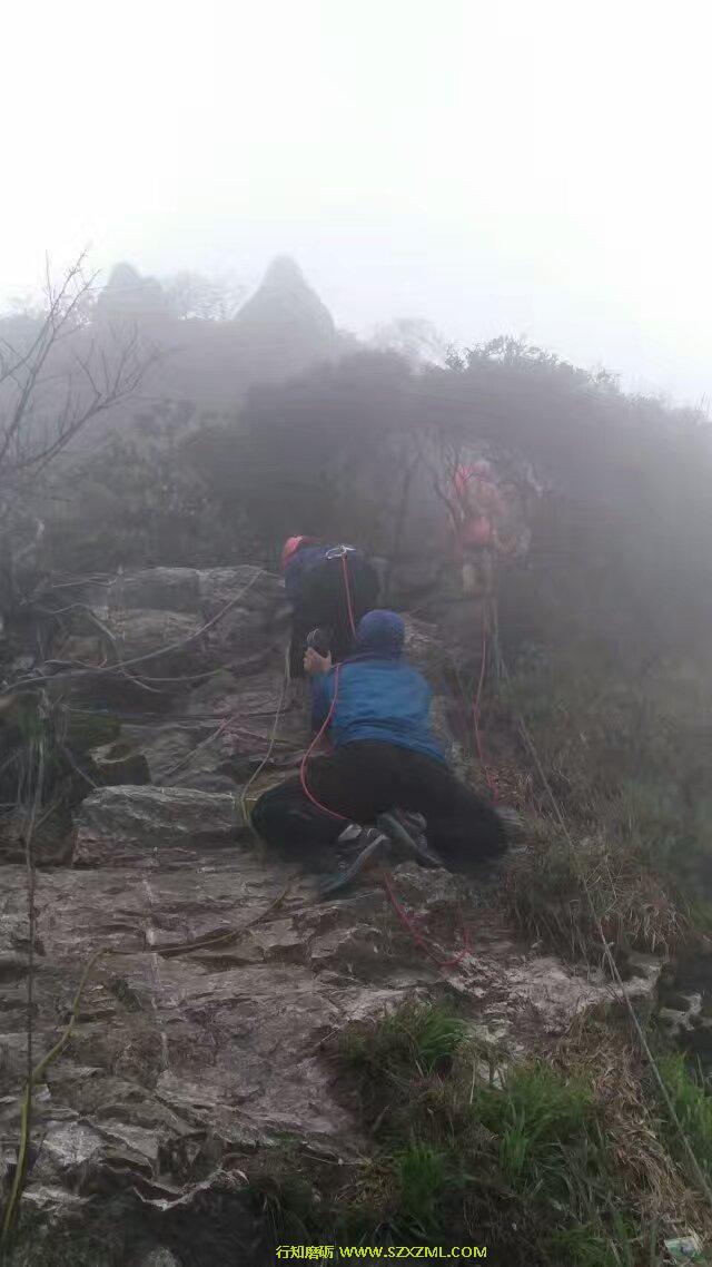 户外也有塞车的时候,一户外群的两位恐高者在断崖山顶已经整整呆了两个钟不敢下,这时候该到方丈大显身手的时候了,方丈大步飞奔山顶,在炎皇的协助下,用我们带的绳索固定好,用娴熟的手法打出蝴蝶结,当手套和脚套并用,这时二组已经赶到与我们会合,岚仁教练立马当先在山峰之间与方丈,用专业扁带和主锁,让两位恐高者安全着陆,普度了两位众生。堵塞时长约50分钟。