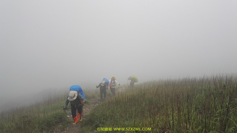 该大黄出场了,CP5→CS2,大黄体力好,是头老驴,心直口快,脾气急,常说心急吃不了热豆腐,有时还得慢慢来。爬过了日落峰,快到望顶营地山顶,远远看见别的驴已经把帐篷扎到山凹了,由于“五一”假期,大家都为了船底顶传说,为了证明自己是头强驴,广东省周边的驴都从四面八方聚集在此,为了打探实情,我和旺仔先峰开路,确定营地已经不能扎营了,如果挤一挤还是可以扎进几个帐篷的,但我们是一个班,一个小团队,两个小组十几人肯定不行,方丈说,山顶有营地但没水源,经大家讨论确定,目标白房子。拉残教练,干干干,最终是大家残了,明白了钢铁是如何炼成的。