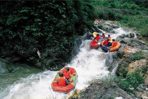 老虎谷暗河漂流位于黄花镇北部,是全国唯一穿越岩洞的暗河漂流,以水急、石怪、林奇、山秀及岩洞幽深、原始古朴、空气清新享誉海内外,受到旅游爱好者的热烈追捧。老虎谷暗河漂流全长5公里,蜿蜒曲折,落差位60多处,高低达90多米,其中穿越一段经过2万多年形成长达800多米的岩洞,洞内景色如天上的广寒宫,遍布千姿百态的钟乳石,色彩秀丽,摄人心魄。下险滩、飞越激浪,有惊无险;过深潭、追波逐浪,听鸟观鱼。身临其境既可领略旖旎的自然风光,又可拥抱大自然的无限乐趣。山在雾中,水在洞中,人在画中,恰似一幅情趣盎然的精品国画。在激流的撞击下,橡皮艇如离弦之箭,向前冲刺。险滩、礁石扑面而来,几乎要把橡皮艇掀翻,却有惊无险。