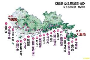 鲲鹏径是深圳最长的远足径路线,全长约200公里,分为20段,穿越山岭、森林、湖泊和溪涧等自然景观。以下是每一段的详细介绍: