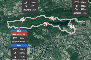 起点塘朗山公园深云广场→悟涛亭→下梅林→梅林水库→梅林公园(CP1)→银湖山→银湖山郊野径→银湖山念晶亭→鲲鹏径一号桥(CP2)→大脑壳→飞来石→涂鸦墙(CP3)→塘朗山主峰→翠竹径→终点塘朗山公园深云广场